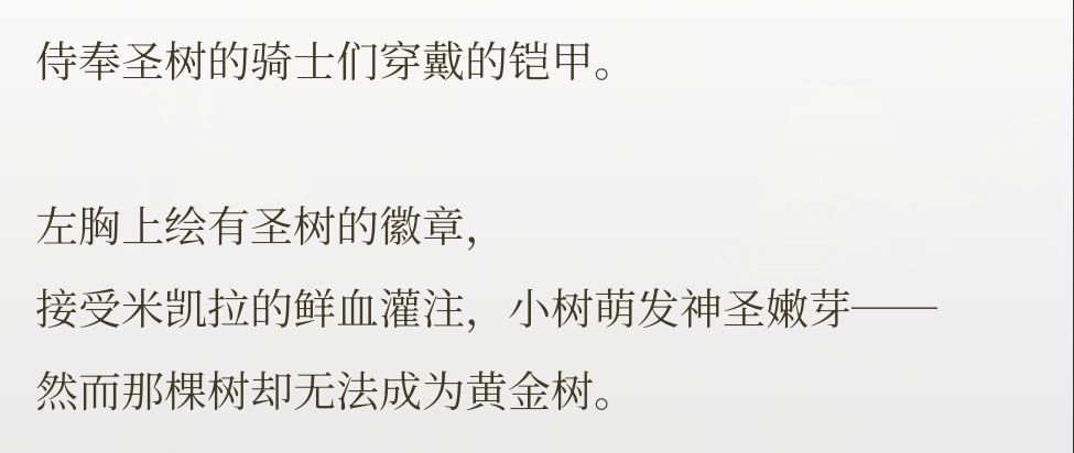 米凱拉帶着妹妹前往化聖雪原,用自己的鮮血澆灌出一個參天大樹,想以此樹取代黃金樹。