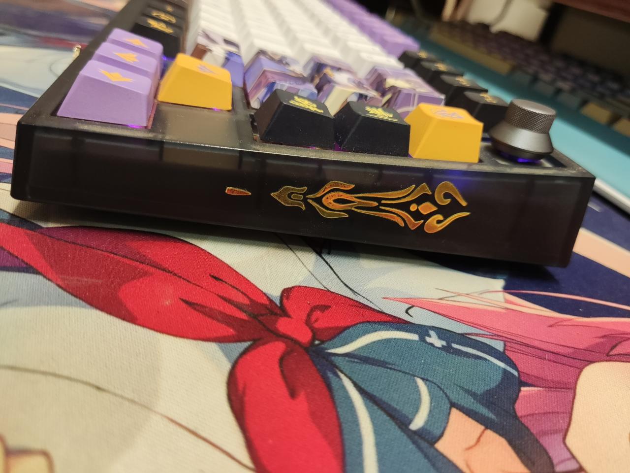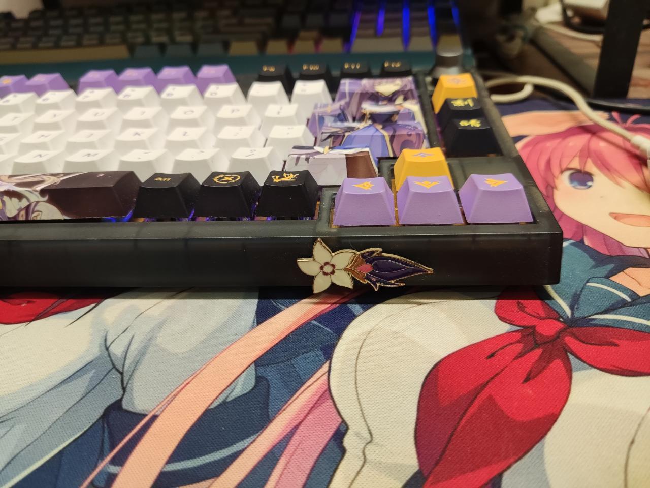 金屬貼:遊戲內刻晴絲襪截圖後摳圖(芭芭拉金屬貼同款摳圖技術),選用金色搭配鍵帽,雷元素金屬貼(已脫落,後續補上)