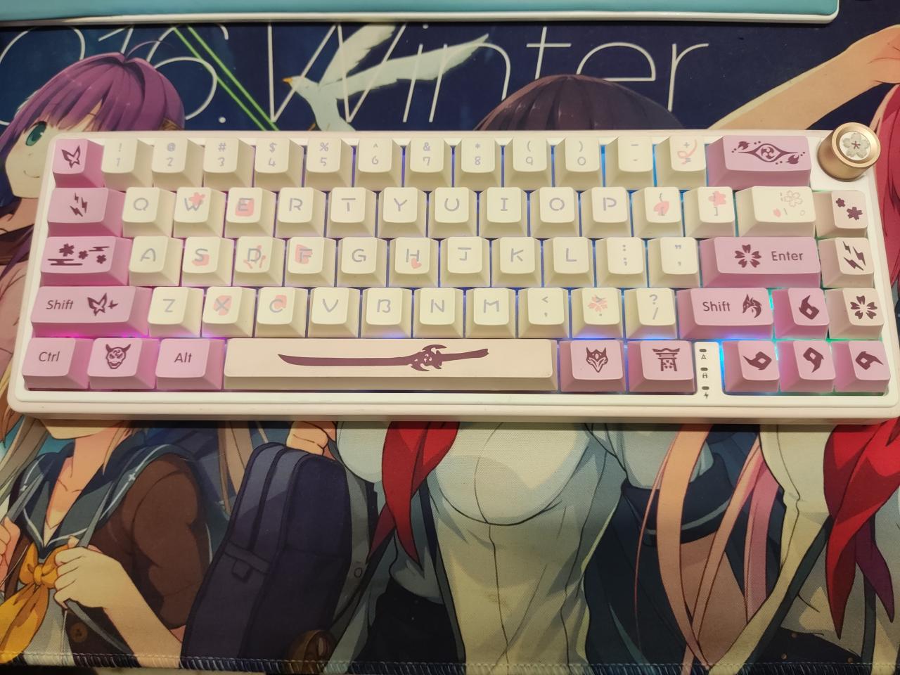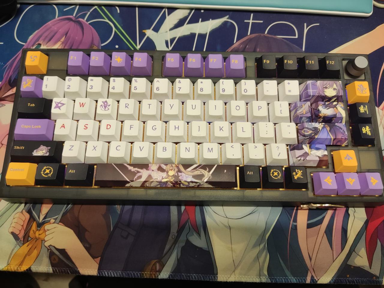 鍵帽:刻晴分屍鍵帽,源自對O第一款刻晴主題鍵盤的復刻,是我買的第一套鍵帽。後續又自己定製了幾顆主題鍵點綴(e,q替換爲技能鍵,還有兩顆字體鍵)
