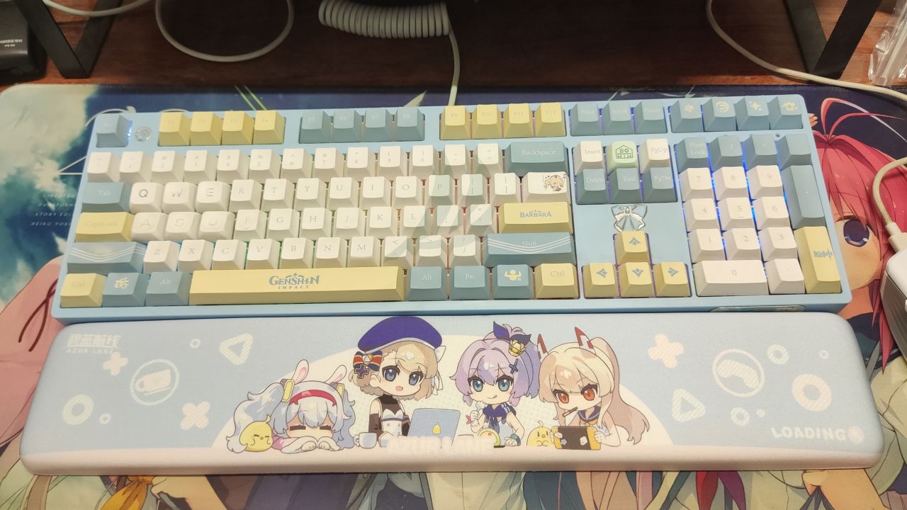 鍵帽是鴿子王外設好久之前的一套芭芭拉主題鍵盤,乍一看有點像海鹽檸檬配色,可惜現在已經下架了,還挺喜歡這種印象款的鍵帽的;