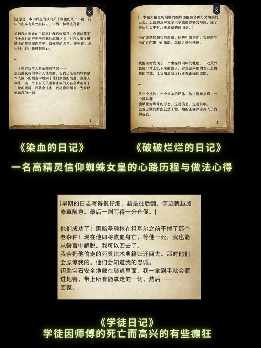 伊林·托斯就是这样一位红袍法师,他出逃的时候还带着死灵书(张大嘴那本),他的目的是复活他的爱人。他带着他的学徒蛰伏在月亮庇所,一边假扮药剂师帮当地人治猪瘟一边偷shi体研究实验,他们应该是⏰1371就开始小心翼翼的在这里生活了。学徒这个身份在塞尔不是随便拜个师傅而已,需要从小具备一定魔法天赋的塞尔人,跟着法师接受训练经历苦难才能成为一名红袍法师。学徒日志中提到的黑暗骑士应该是莎尔的暗影法官,袭击塞沦涅信徒村落的时候把红袍法师一起端了(也为夺走死灵书)。师傅死后他终于可以回祖国效忠的喜悦(即使他不愿意效忠红袍法师,但契约还是要遵守),好死不死逃跑的时候被“超越”成功觉醒为蜘蛛女王的高精灵给处决了~卒。这个地方网上也有大佬分析其他猜想,这是我的倾向。