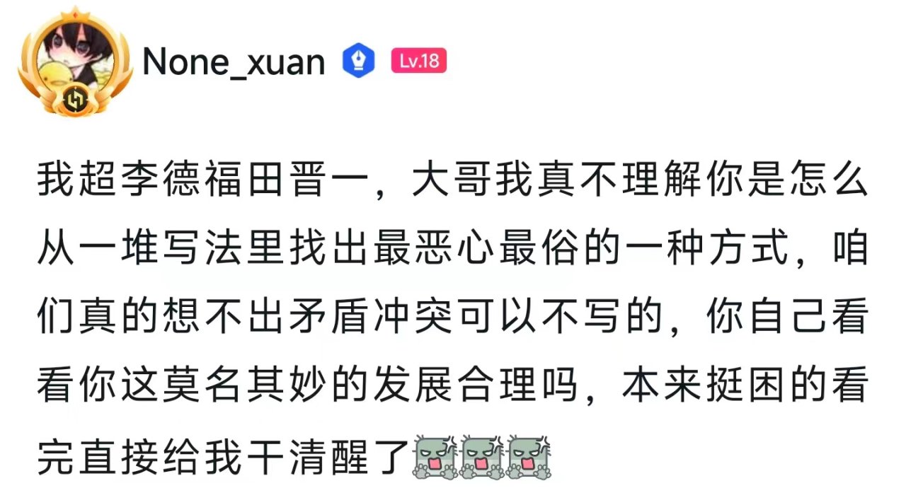 讲真的,本来我看前面的章节就已经有些不满了,作者对于主线把握的不明确以及情绪推进的糟糕表现已经让整部作品的观感堪称灾难,而最后这一个冲突的引入,就是直接引爆了我挤压已久的情绪,直接进入红温状态,气得我半夜打开手机发了个帖子。