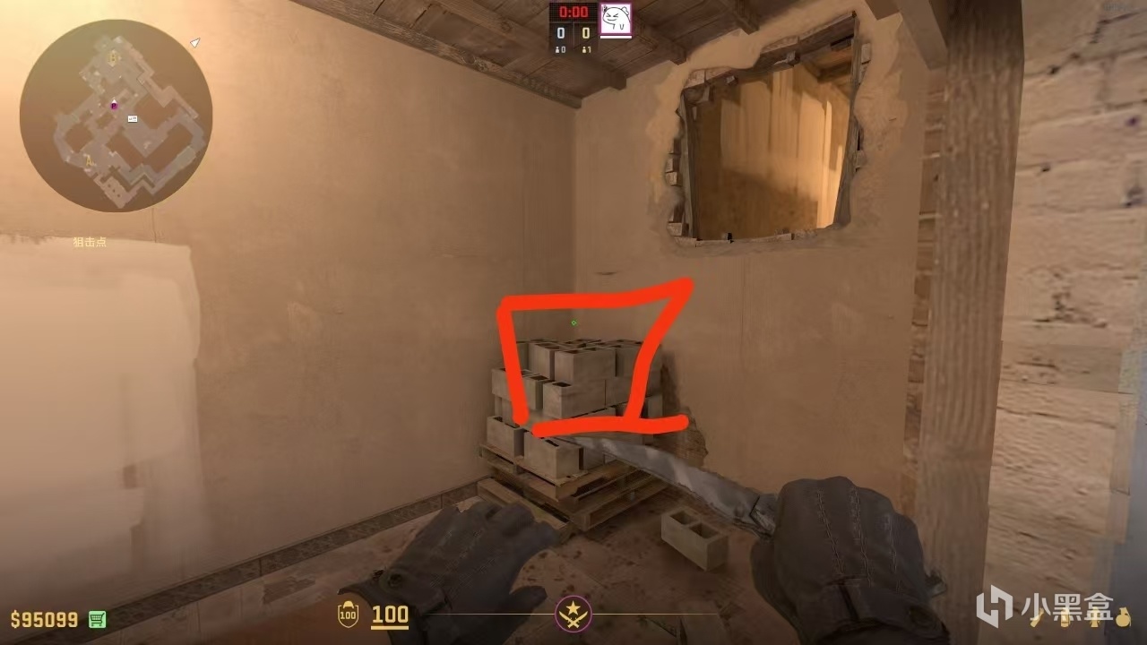 2)进到VIP之后准星与黑屋中间的杠杠对齐,沿着红线助跑到大概纸壳的顶端起跳(一个向右的旋转跳),之后踩到窗户上。