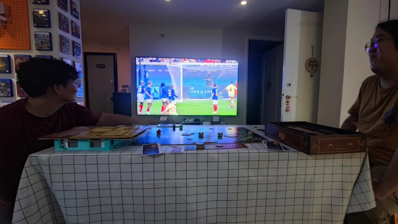 然後就發生了圖3的一幕,仨人一邊玩桌遊一邊看球賽,如果昨天晚上能在來點小燒烤和啤9那簡直太爽了,不得不說這次決賽熬夜是真的值,一下看了八粒進球。比賽的戲劇程度堪比當時盒友打的FIFA。