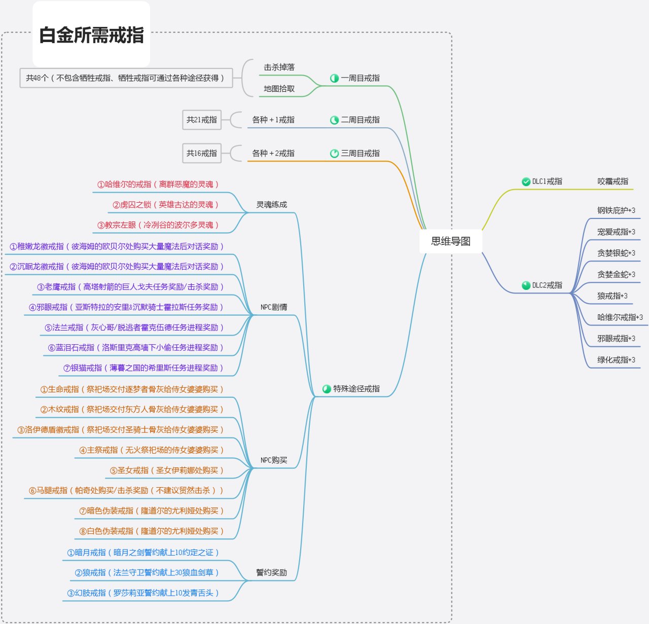 思維導圖的左側爲遊戲白金所必須要收集的本體戒指;遊戲右側爲非必須的DLC戒指,右側諸多+3戒指玩家僅需按需所取,儘量一週目拿到諸如貪婪金蛇+3、哈維爾+3、寵愛+3等好用的戒指,在二三週目的快速rush BOSS速通中就可以直接不進入DLC浪費時間。