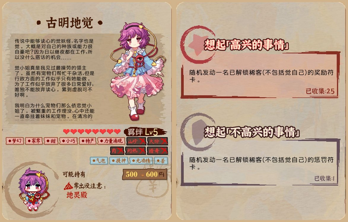 ▍隐藏伙伴,琪斯美和小野冢小町,分别将旧地狱和地灵殿羁绊角色的等级提升至最高级后,第二天在对应的地图触发剧情。
