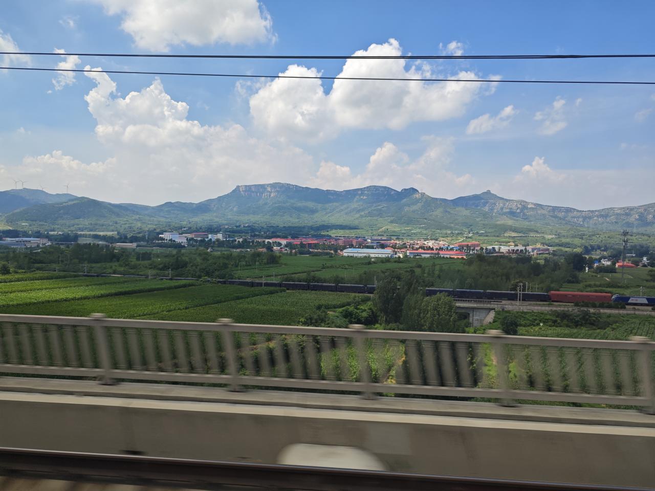 中间肯定是经过泰山,火车轨道离泰山很近,哇噻一看确实很吓人呀。我本来以为山峰就那么高,没想到山峦直接顶到窗户上面,雄伟壮观。对我这种生活在平原的来说简直降维打击。山脚下的泰安不知是市区还是镇上,与高耸的泰山相映成趣,别有一番风味。这么高的山想要爬上去简直要累死,反正我不去,就算不是夏天也不去,火车上看看意思意思好了室友问我要不要去爬泰山,我果断否定了。