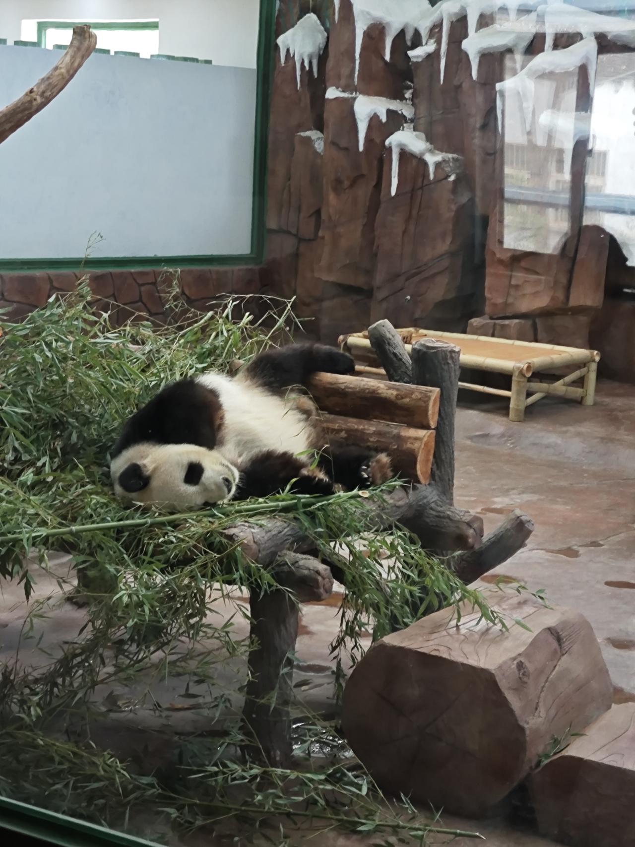 济南动物园还有两只熊猫华奥和雅吉。只能说国宝不愧是国宝,不仅享受空调,还有冰块🧊降温,我们人类要想乘凉都要去蹭它们的空调。这种天气下,熊猫也开启了躺尸形态。