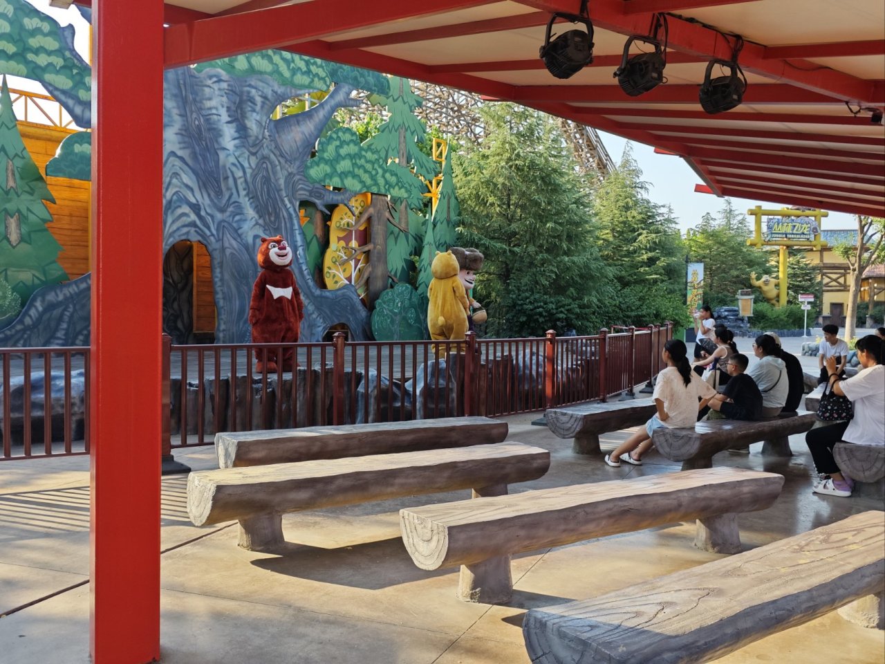 休息处的熊出没表演,大热天的表演小哥还没消失在后台就迫不及待摘头套了。