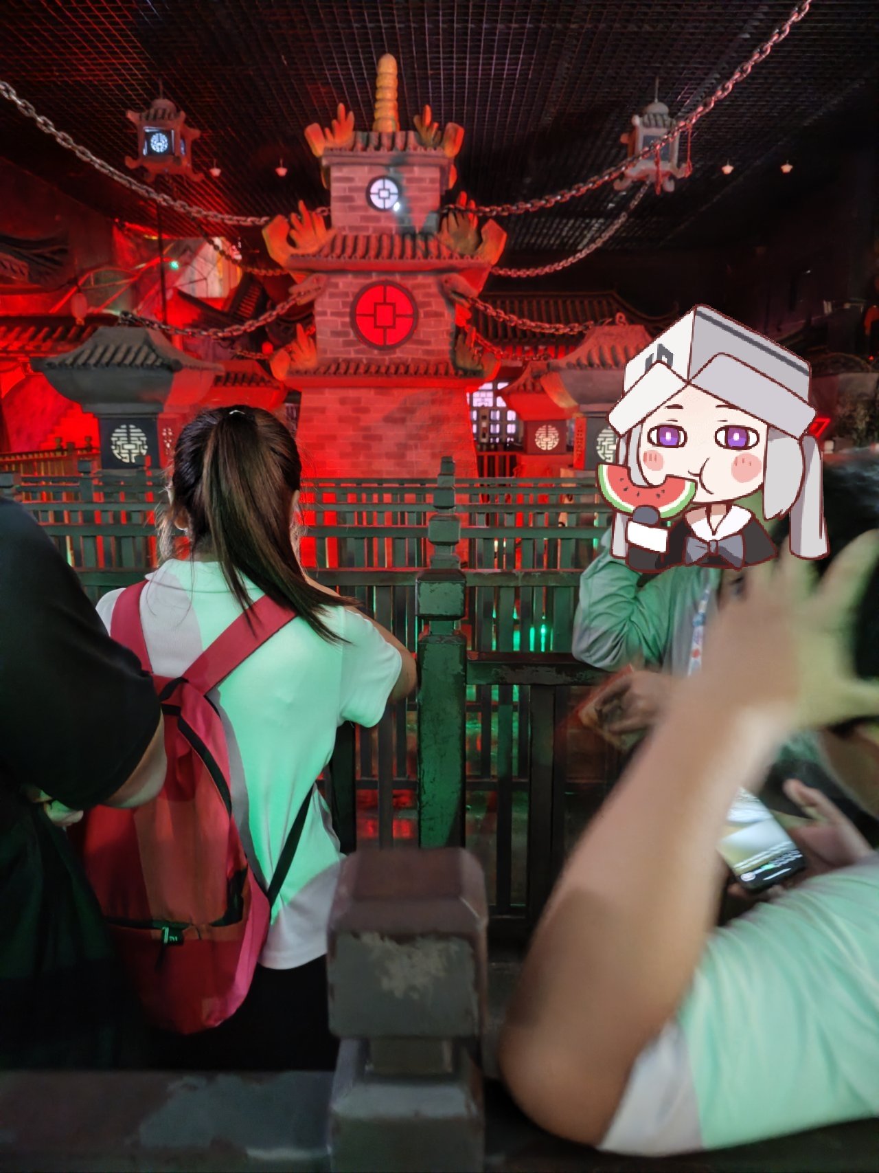 开头不太顺利,一开始图新鲜坐一次过山车嘛,结果那么激烈眼睛都睁不开,全程啥都没看见光闭着眼了,下来人都晕晕乎乎的。于是在第一次体验后我决定今后再也不碰过山车了。第二个是鬼屋,因为额外收费,又像密室逃脱那样拼人的,而且我再怎么说也害怕嘛,所以我打了退堂鼓,转而去找鬼门关这样的室内车做代餐。我原以为它像人坐在车上然后人偶突脸的流程,谁知这是室内过山车,在一大片开阔房间飞速冲荡。两个项目下来人直接丢了半条命。