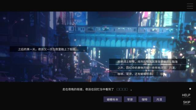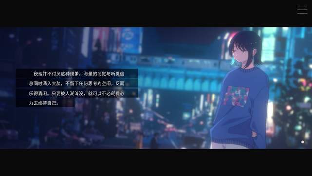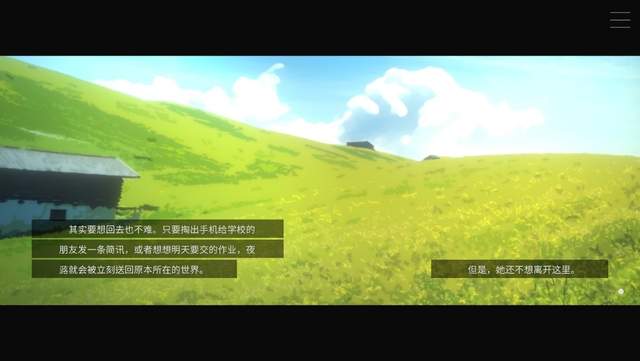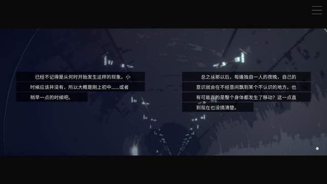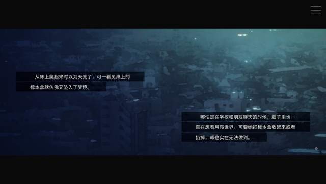 我想美術部分的表現還是爲了主題而服務,有足夠的美感卻也沒有喧賓奪主,讓玩家們能夠將更多的目光聚焦在文字上。畢竟故事既屬於女主角夜蕗,也屬於你和我這些普通人——夜蕗那似乎是從剛上初中時覺醒的能力說到底也很普通,即每逢獨自一人的夜晚,意識或是整個肉體就會飄到不同的世界去,自由自在的徜徉於各種場景中。