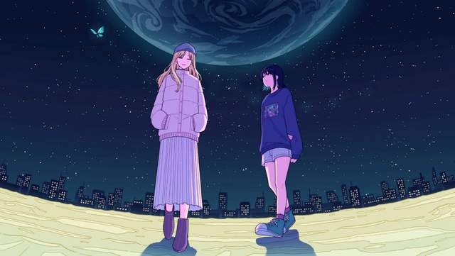 對於人物的描繪談不上很精細,大概是爲了代入感。女主角夜蕗一身黑髮、T恤加上短褲的搭配,想必這就是傳說中的路人女主吧。倒是她的朋友真緣以棒球帽加羽絨服加長裙的裝扮登臺,顯得有些出挑,果然月球人確實有其獨到之處(?)。