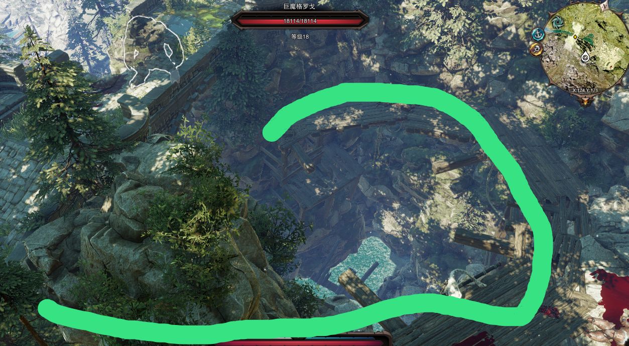 還有一條路,是洞穴的後門。18級的巨魔下面有彎曲的木橋,沿着綠線的方向走到木橋頂端,一個位移就能下去,進門之後直接能看到莫德斯
