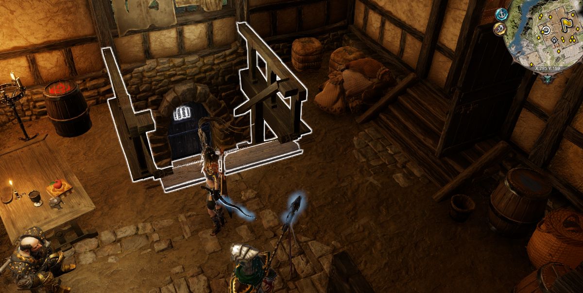 來到黑牛酒館X:295 Y:159,準備進入地下層。你會發現一個看門矮狗,賄賂/【罪犯】標籤都可以進去,不要和商人開戰。