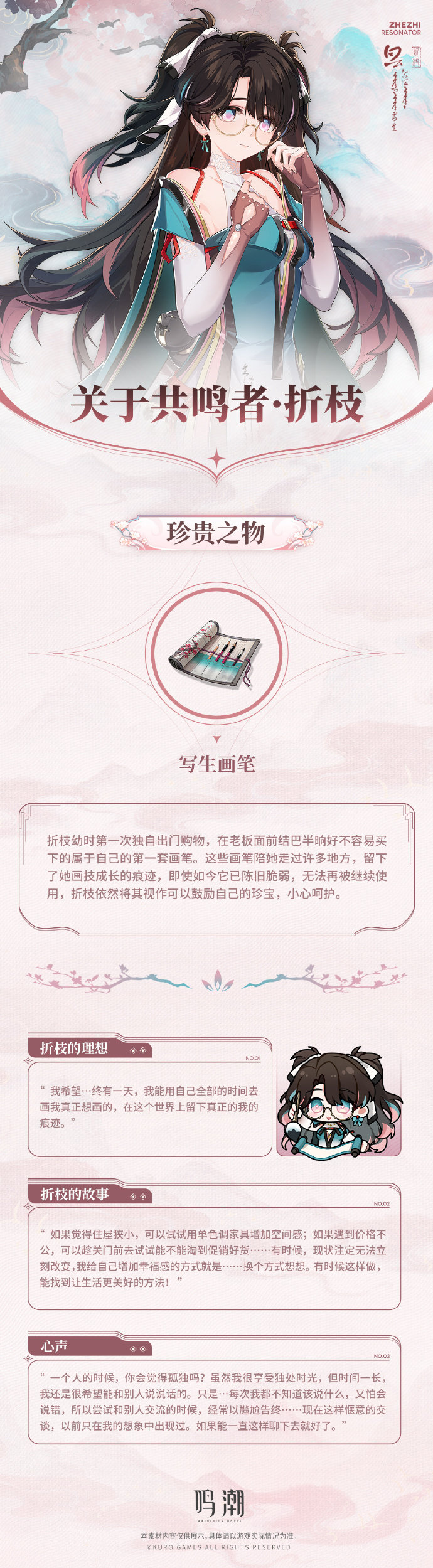 《鸣潮》官方公开了1.2版本的新角色“折枝”的角色情报,新版本将于8月15日正式上线。