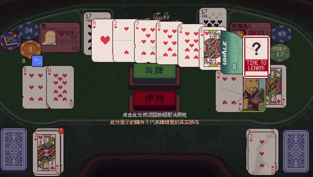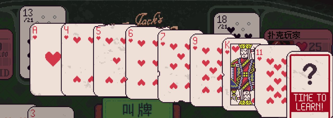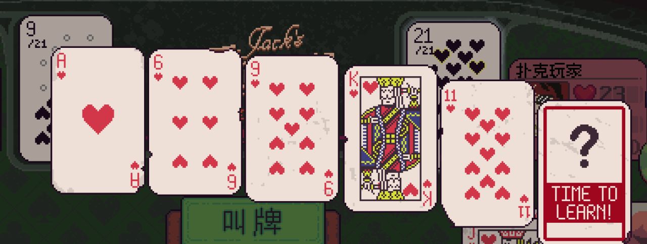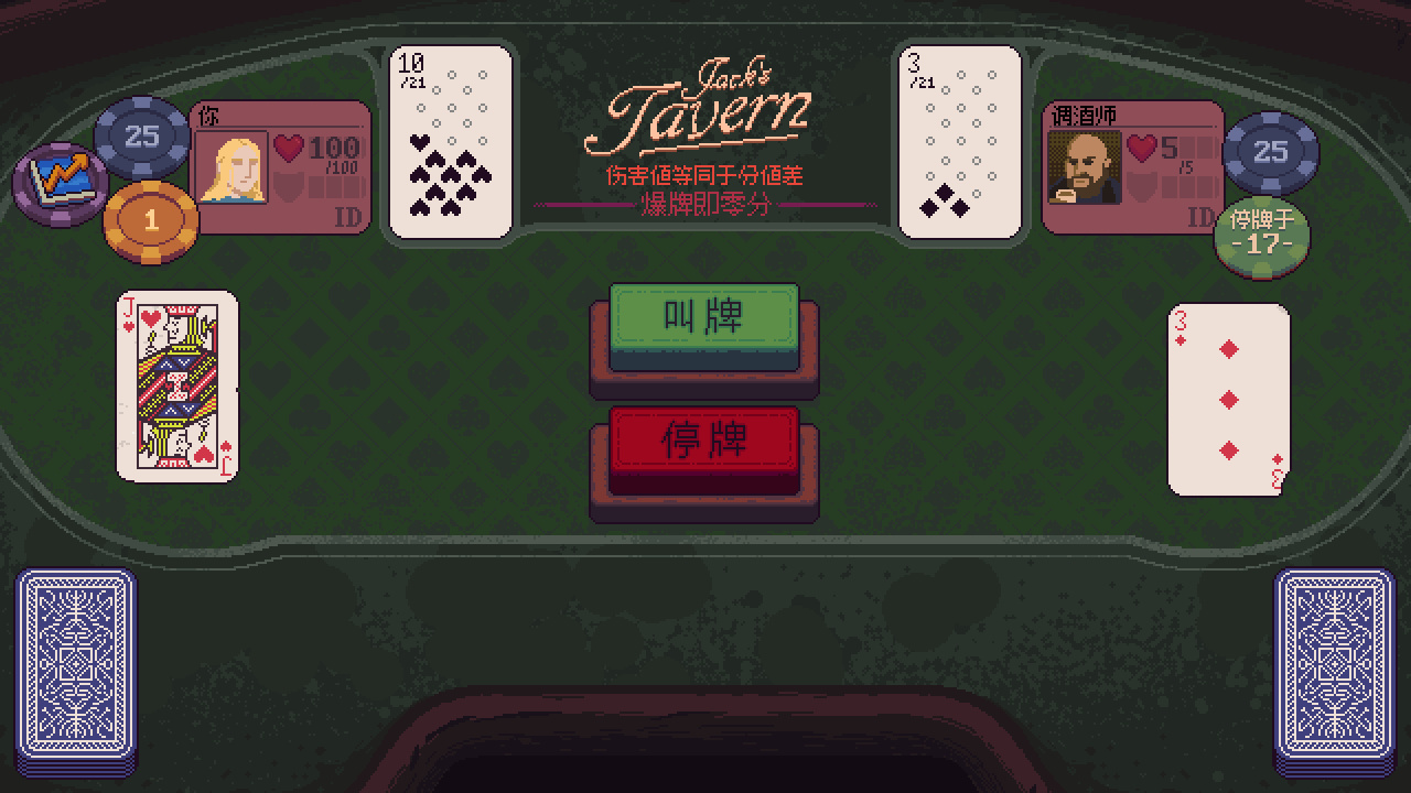 可以【叫牌】和【停牌】,叫牌後,你會抽取一張手牌,並且得到卡牌大小的點數。