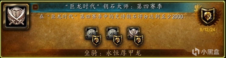 《巨龍時代》鑰石大師:在《巨龍時代》第 4 賽季期間獲得至少 2,000 點的大祕境分數。獎勵上圖的坐騎:永恆厚甲龍。這個坐騎不能飛,是地面坐騎!不過現在2000分很好打,剩下的一週多時間完全夠了。