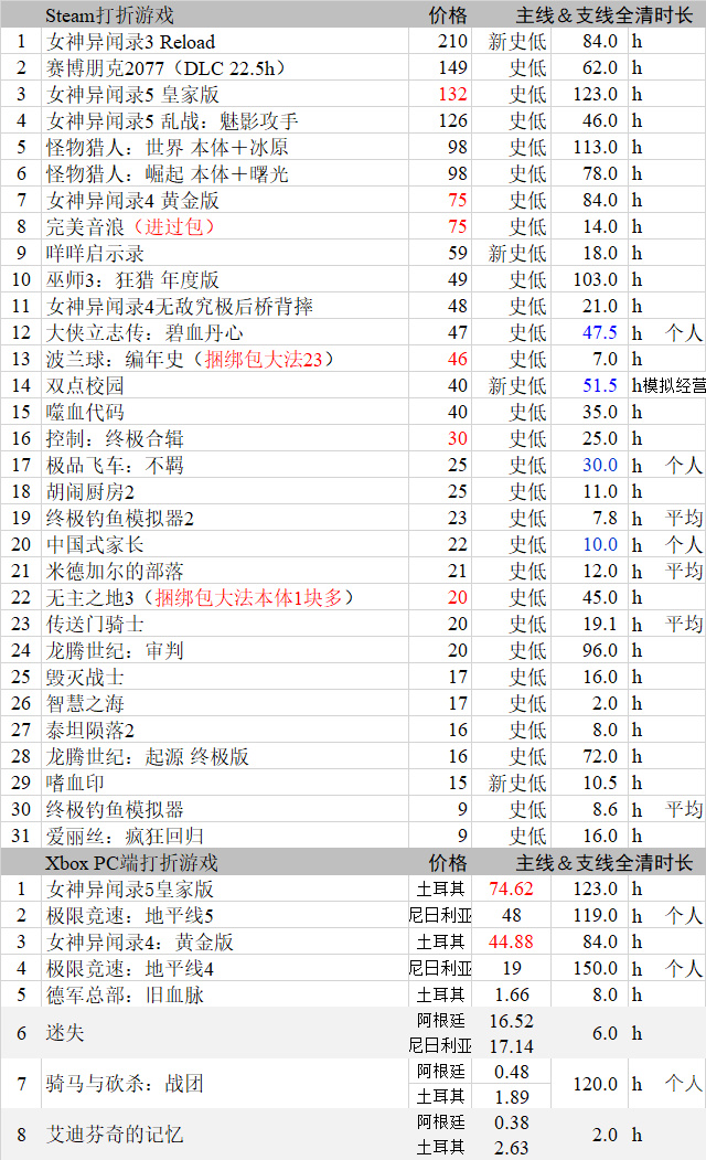 Steam和XboxPC端低價區近期促銷打折好評遊戲推薦(含主支線時長、彙總表格)