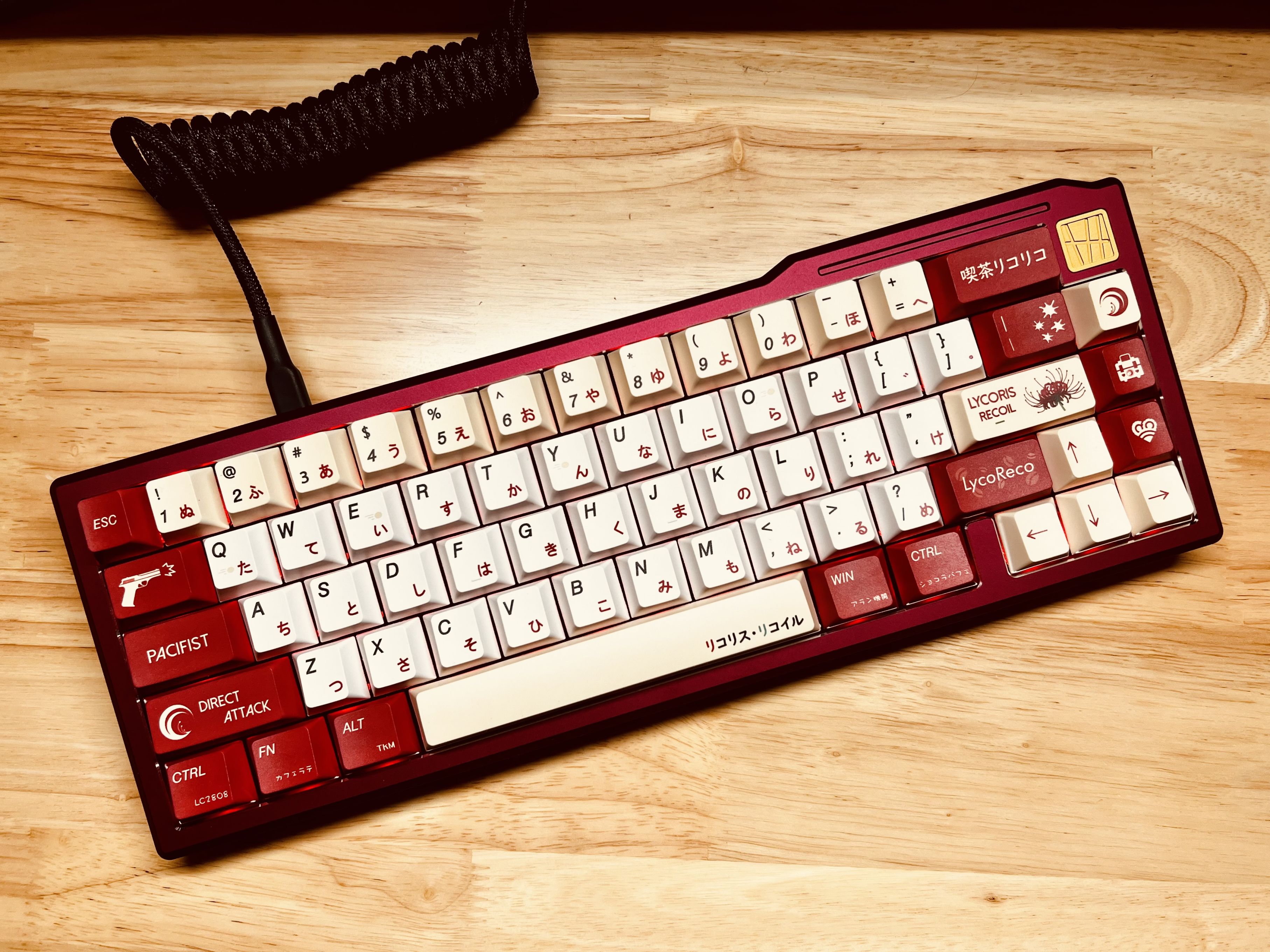 最终前前后后折腾了接近一个月,这把Hyaline65%终于满足了我所有的预期。最后夸一下这套千束的键帽,本身设计和色彩在二创类键帽中就属于比较优秀的作品,森美的代工质量更是物美价廉,除了水口有毛边外,键帽在缝隙控制、色彩处理,触摸手感这些方面都是200以内价位的T0水准。可惜这套键帽没有阶梯大小写,不过这个套件也用不到就是了。