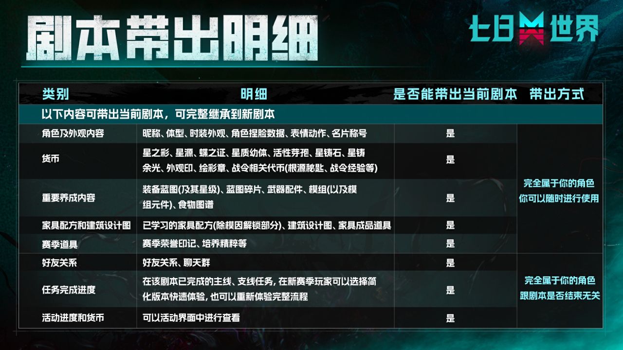 2.每個賽季週期會根據你選擇報名的劇本而有所不同;而每個劇本又會根據自身特點將體驗週期劃分爲多個階段,隨着服務器開服天數逐步推進,解鎖遊戲內容,以保證你遊玩體驗的豐富性和節奏變化。當劇本內容完全釋放,迎來賽季最後一個修整階段時,你就可以通過報名方式,帶上自己在這個劇本中的收穫,去新的劇本進行遊玩,體驗不一樣的內容。當然你也可以繼續待在當前服務器中停留遊玩,繼續完成未竟的冒險,直至休整階段結束,目前的休整階段爲四周。