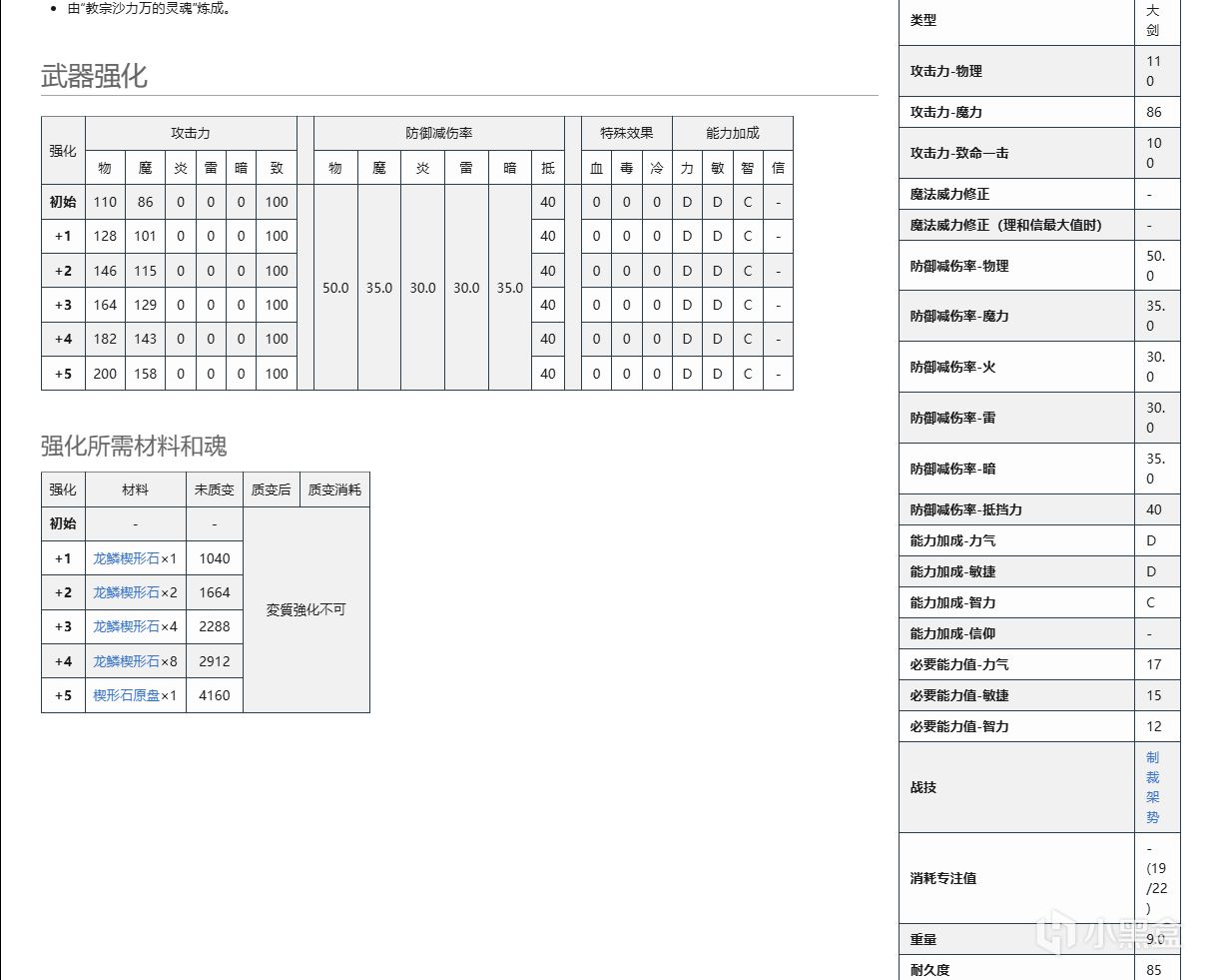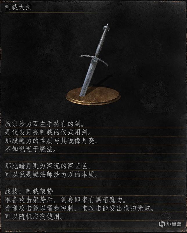 大劍中的低熱度但好用的武器,三屬性補正讓其即便在高周目仍有可觀傷害,前期純力敏配合戰技也附帶有不少魔力屬性,中後期小水桶傷害更是不俗,重量、動作模組、長度皆是大劍標準水平,自帶暗月光劍特效,強度與顏值雙在線,推薦使用。