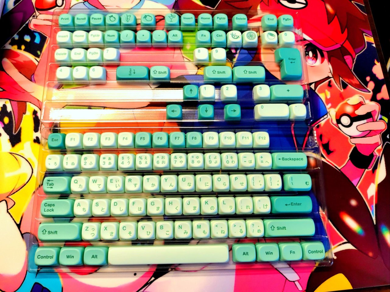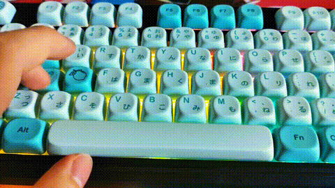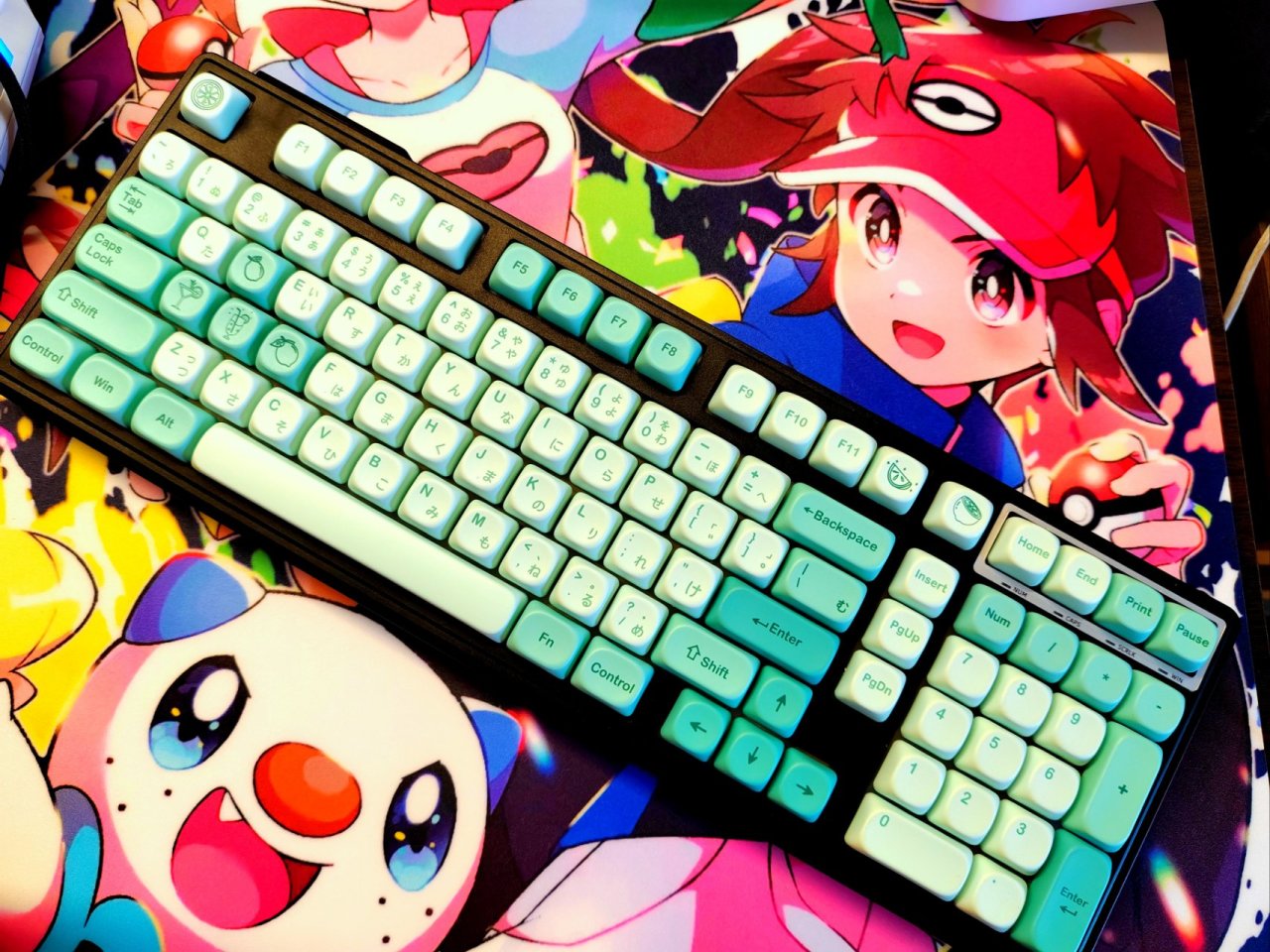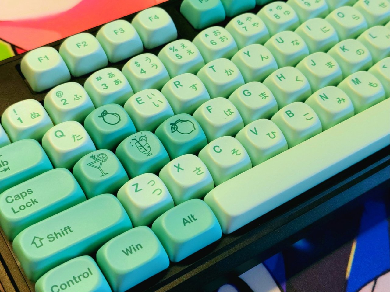 這一款薄荷汽水整體上呈現出來的顏色就如同其名字一樣,宛如薄荷糖一樣的乳白色鍵帽和淡青色的鍵帽共同構成了這一組鍵帽。並且這款鍵帽整體採用了熱昇華的工藝,字體都位於鍵帽的正上方,更加的容易辨別字符,同時右下角還有着片假字體在右下角,整體上的搭配還是挺清新風格的。