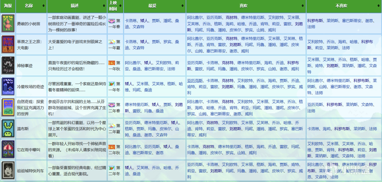 電影院一共上映 8 部電影。電影根據玩家解鎖電影院時的季節開始上映,以每兩年爲循環。所有“第一年”的電影上映過後,會上映“第二年”的電影,然後重複。