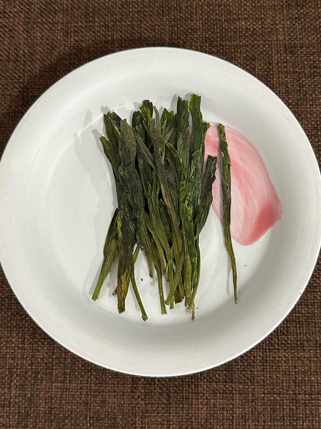 幹茶外形呈墨綠色,碎茶比較少,這也是我買猴魁比較在乎的點之一。茶葉確實有“兩頭尖”的外形。這裏提醒一下,有些不良商家會拿“太平布尖”當太平猴魁賣,而布尖是扁平狀的,沒有兩頭尖和茶身網格紋的特徵,謹慎挑選,防止買到不符合價格的產品。