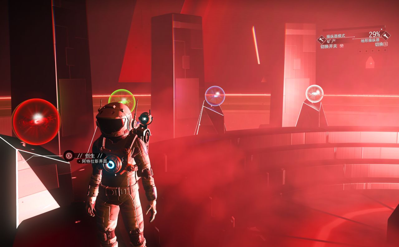 之後會指引我們去當前星系的傳送門,穿過傳送門到某個星球,經過16秒倒數後我們傳送到阿特拉斯界面。在這裏我們與阿特拉斯對話選擇穿過星系中心並創生新宇宙(開啓二週目),有四個不同顏色選項,據說紅色宇宙偏“熱鬧”,衝突多,極端星球多;綠色宇宙偏溫和,樂土更多;藍色宇宙冷寂,與紅色宇宙相反;青色宇宙平衡,跟歐幾里得相似……