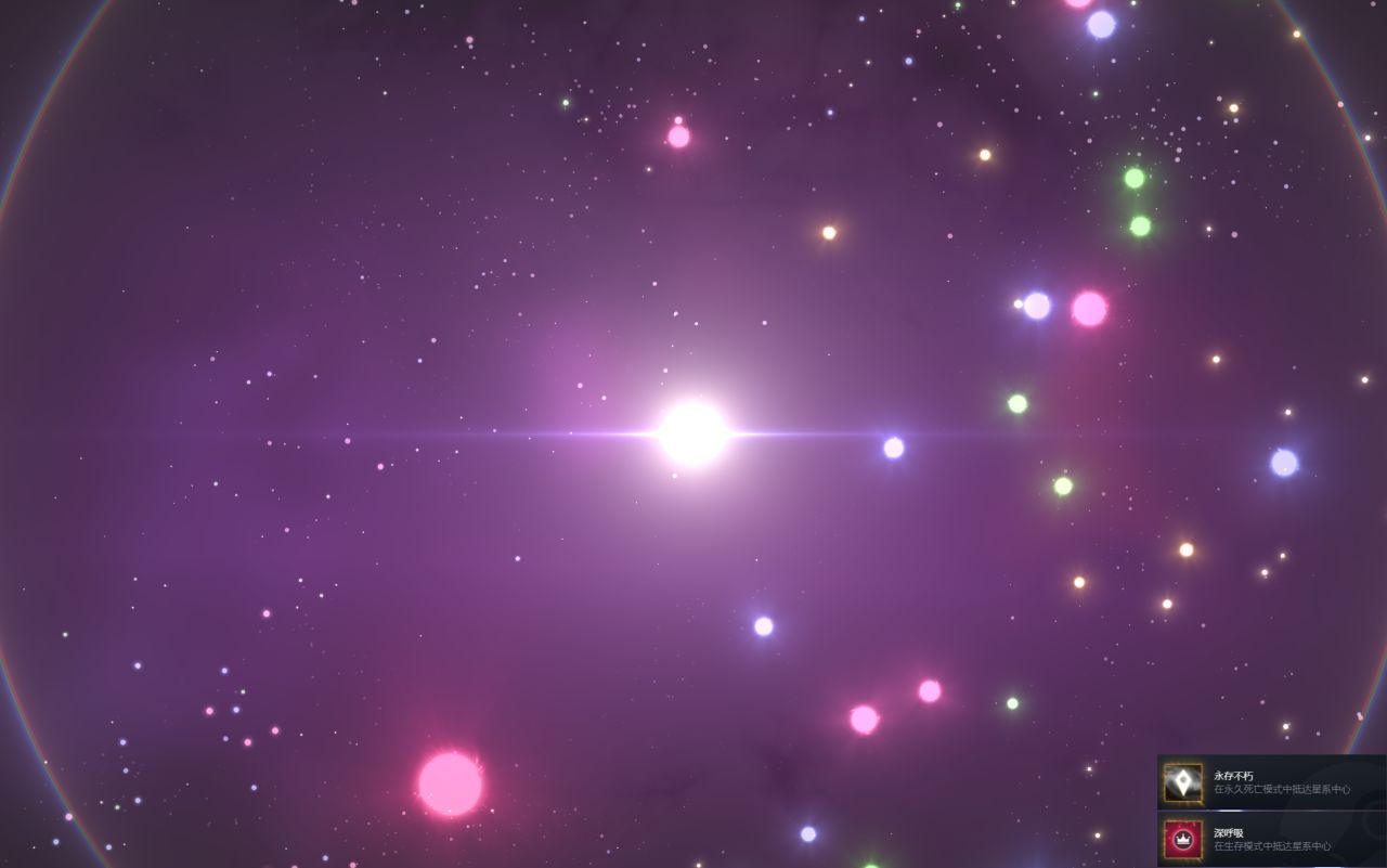 選擇創生,億萬顆恆星會坍縮到星系中心,伴隨着充滿史詩感的音樂,一陣白光後,新的宇宙誕生了。屏幕右下角彈出兩個成就(都快忘了是在永死難度下通關的了)。