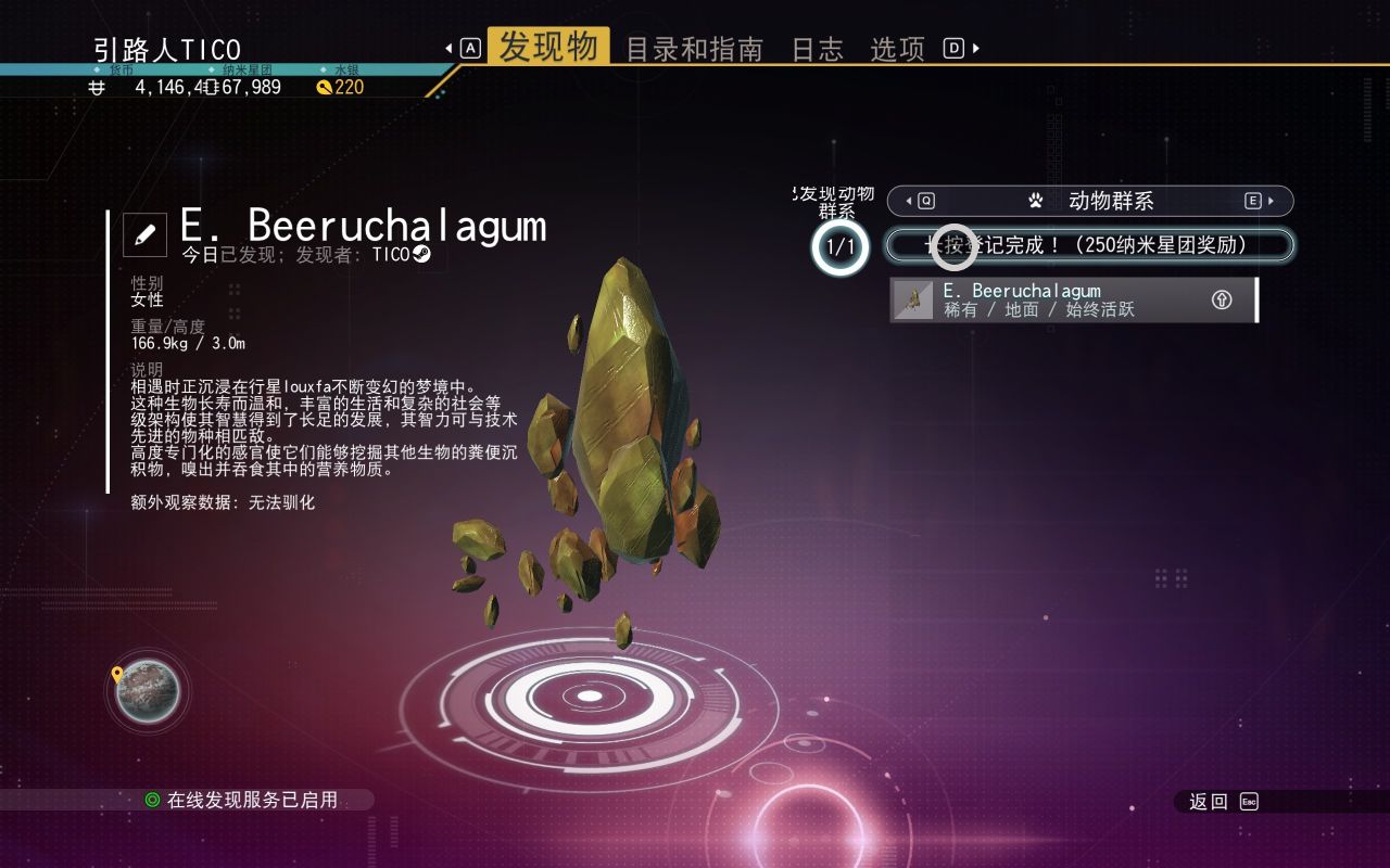 先說掃描動物。我們可以找整個星球只有一種動物的星球,這類星球通常在祕境星系容易找到,即紅/藍/綠色星系。我們一共完成十個星球的掃描就可以達到最高里程碑了。