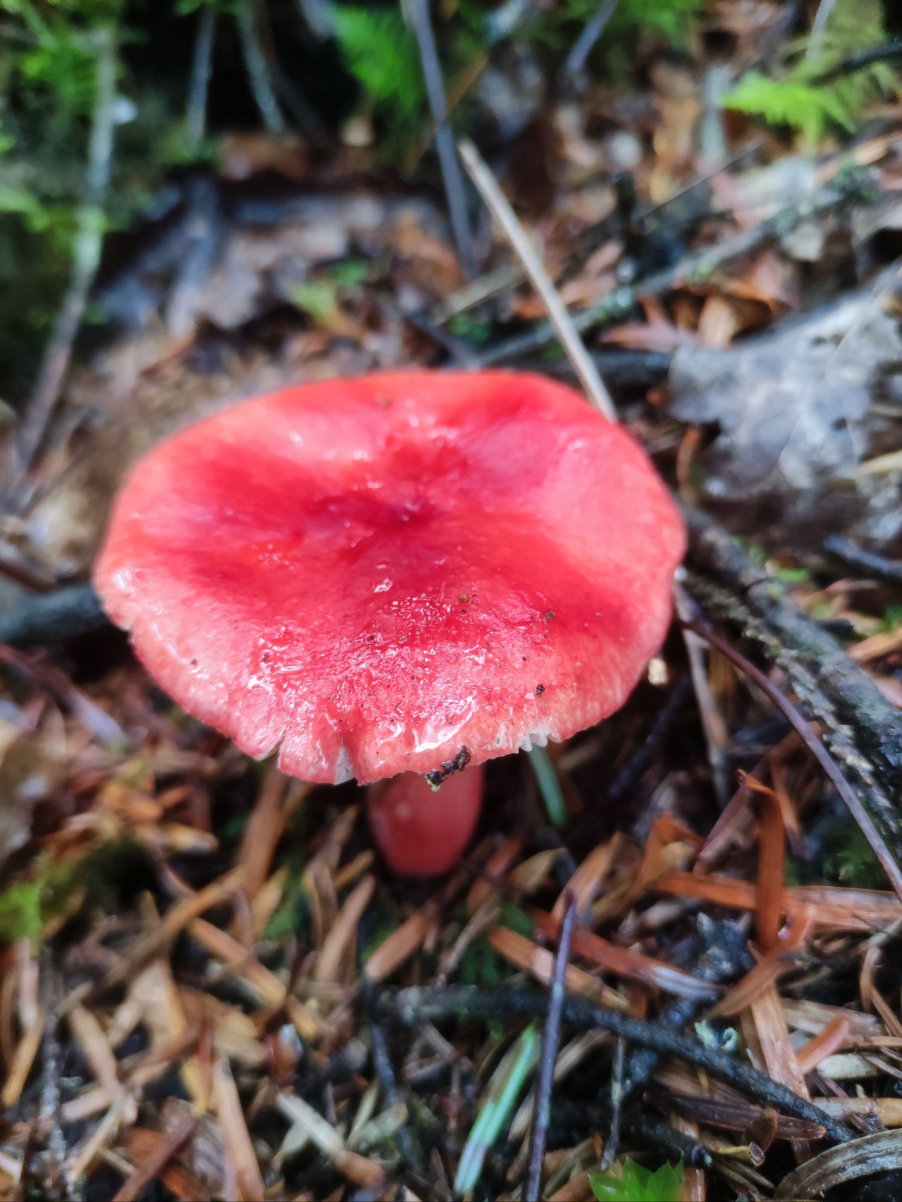 這種紅色的紅菇想判斷毒性的話可以生嘗一下,下面這個嚐起來就是又苦又辣,所以可以判斷有毒