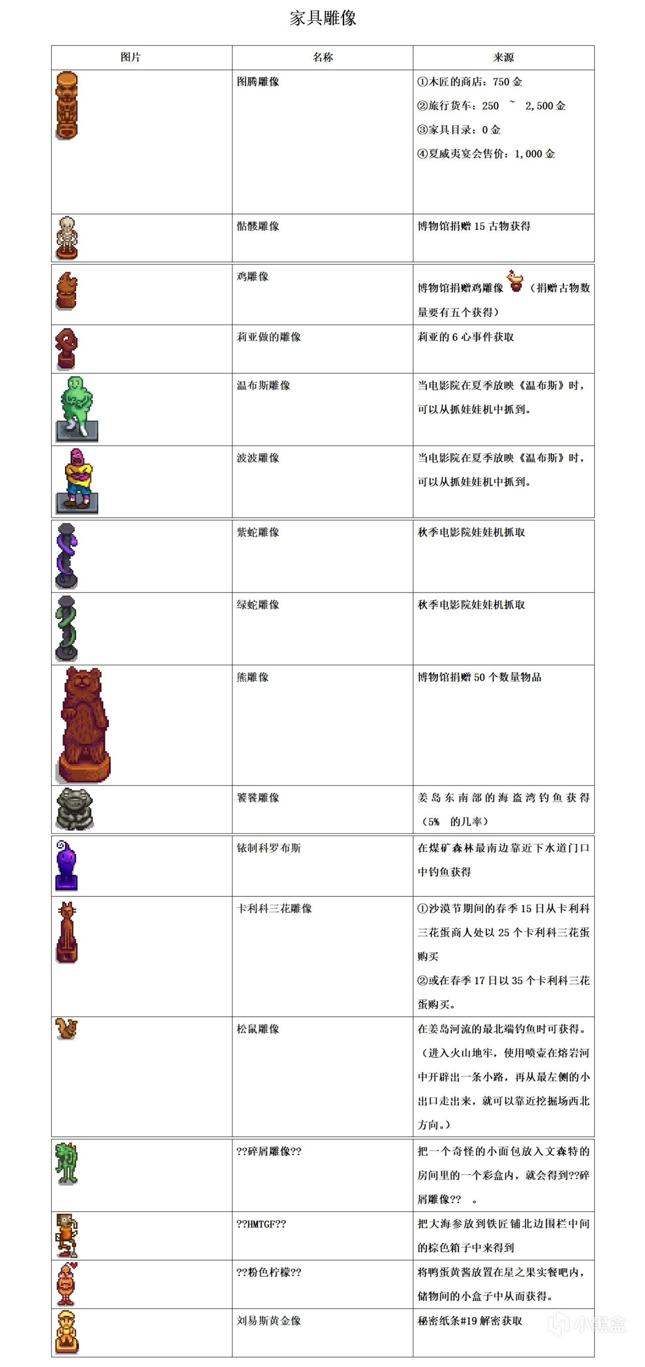 ④隨機從鑽石、銥錠、萬象晶球或金錠中生成一個。(如果當天有村民過生日,雕像則會生產一件該村民最愛的禮物)