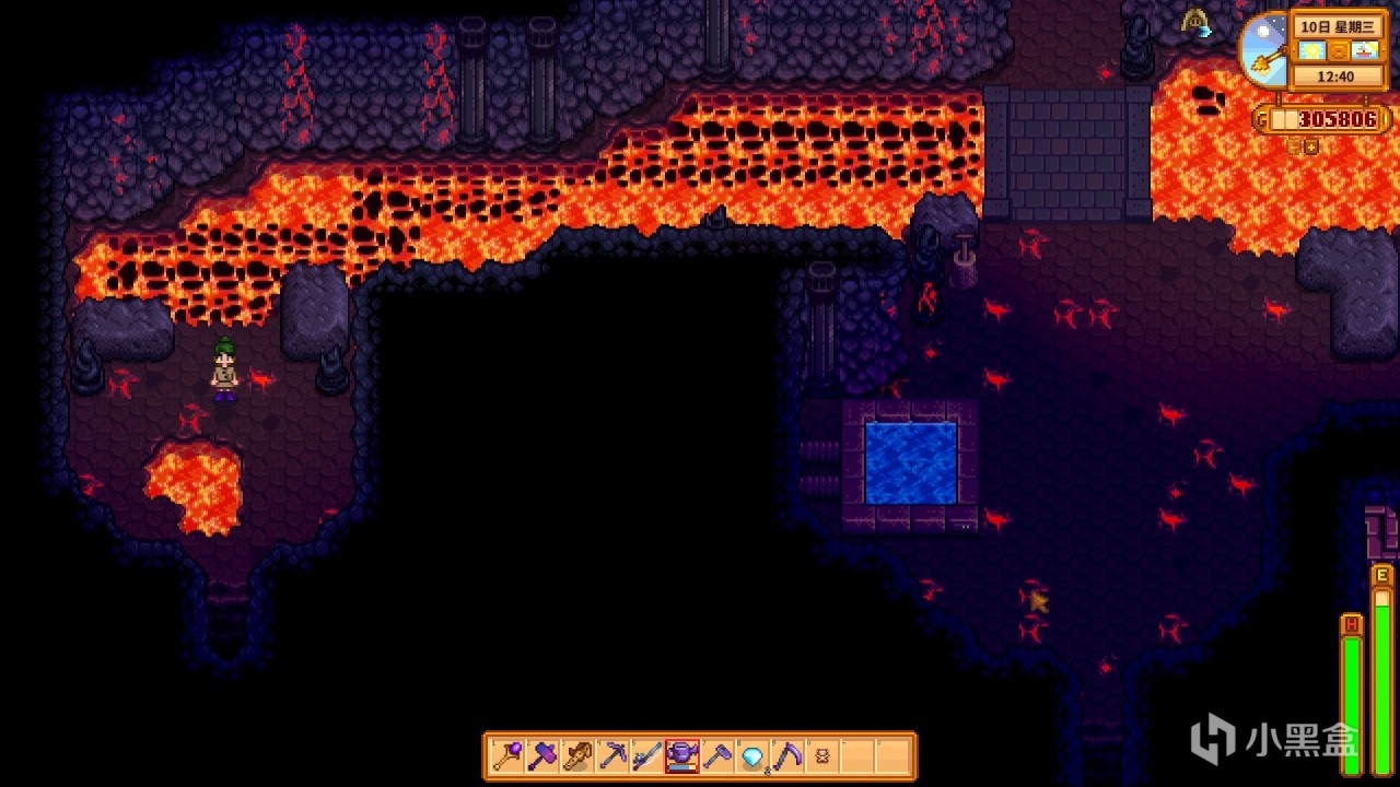 (進入火山地牢,使用噴壺在熔岩河中開闢出一條小路,再從最左側的小出口走出來,就可以靠近挖掘場西北方向。)