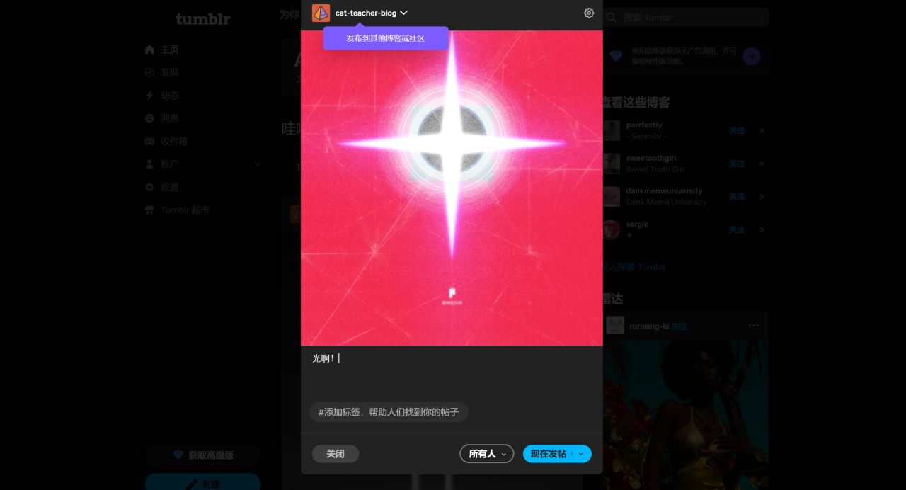 需要你在Tumblr里发帖子,它的内容是对应你在Tumblr的内容。
