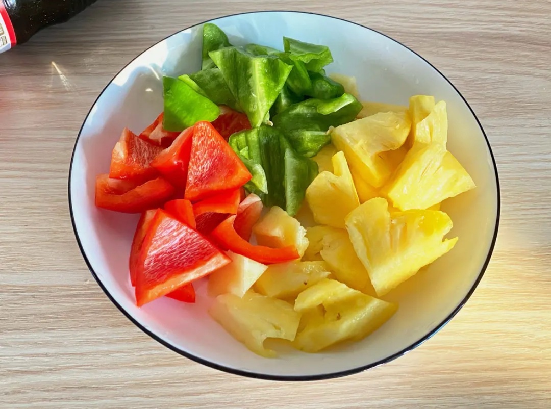 1.青紅椒切成小塊,菠蘿鹽水浸泡五分鐘後再切成小塊備用