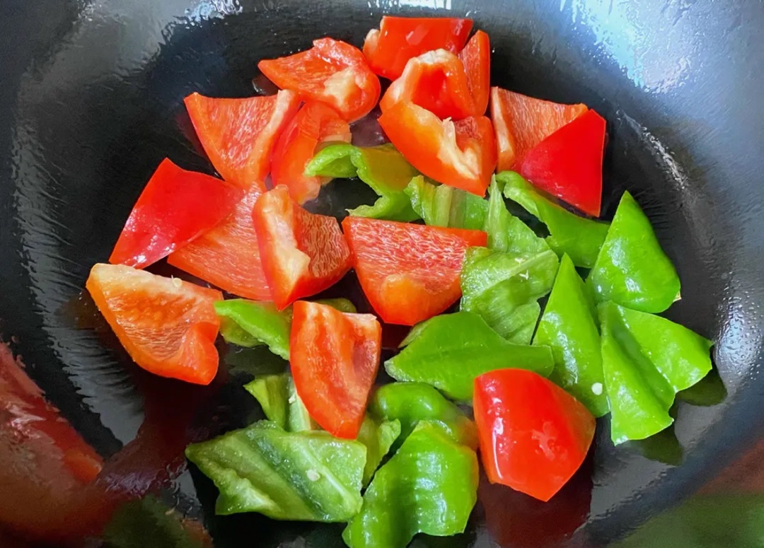 6.把青紅椒炒制斷生,倒入晚中備用