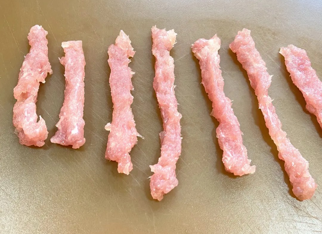 2.裏脊肉切成一釐米的厚片,用刀背拍至肉質鬆散,之後切成條備用