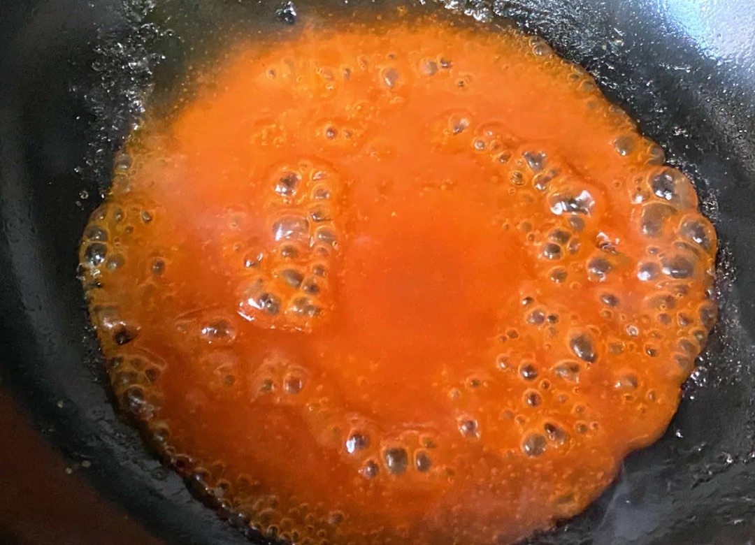 7.準備醬汁:兩勺蕃茄醬、一勺白糖、一勺生粉,加入半碗清水攪拌均勻,倒入碗中中小火煮至濃稠