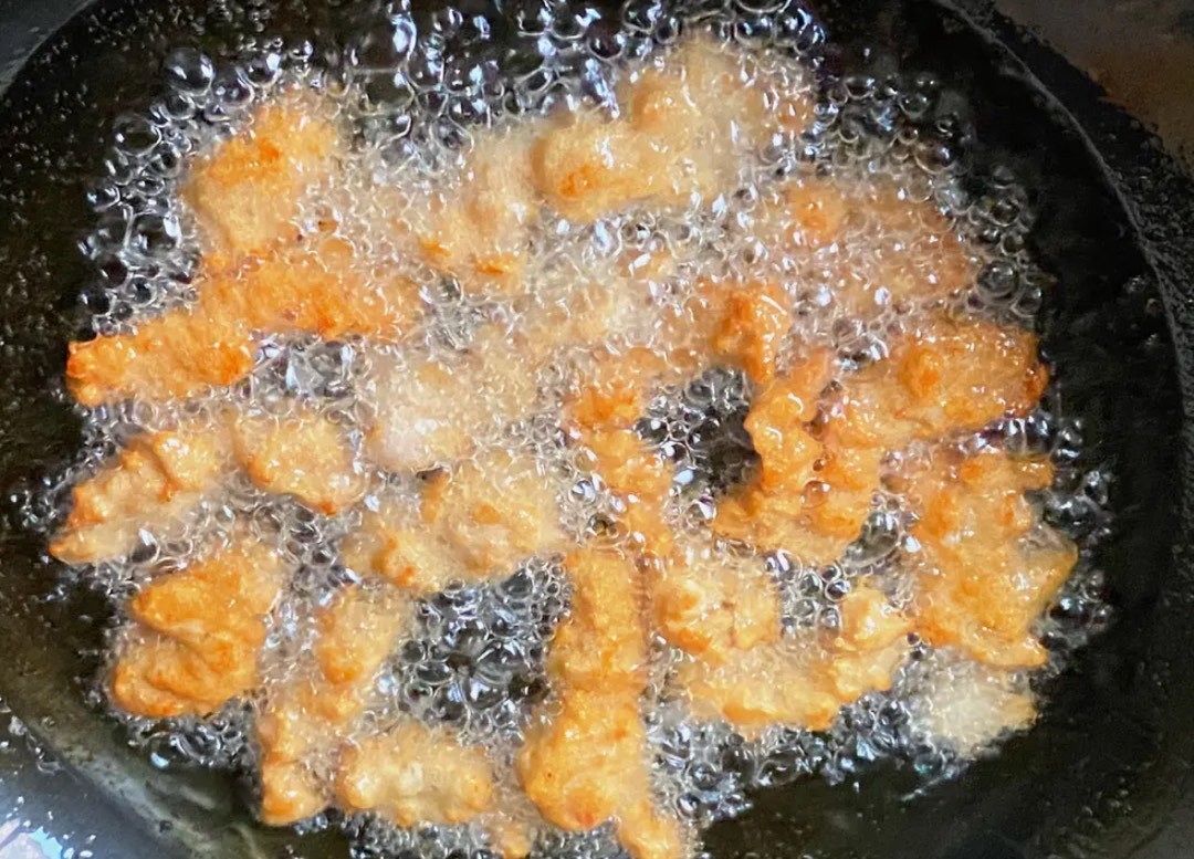 5.鍋中倒入,油的量比平時多一些,油熱後把裏脊肉放入炸製表面金黃撈出,油溫升高時,下鍋復炸半分鐘,撈出控油