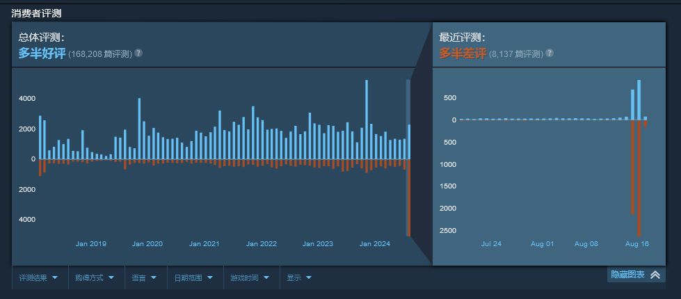 按理说游戏应该受到热烈的欢迎,然而 Steam 上许多玩家给出了差评,导致游戏一度获得“大多差评”的近期评价。这主要是由于新的 UI 改动。一些玩家表示,虽然新的 UI“看起来很漂亮”,但使用起来却是“一场噩梦”。他们还提到,与旧 UI 相比,更新后操作更加繁琐,且屏幕上提供的信息也更少,必须“不断在子菜单之间切换”。
