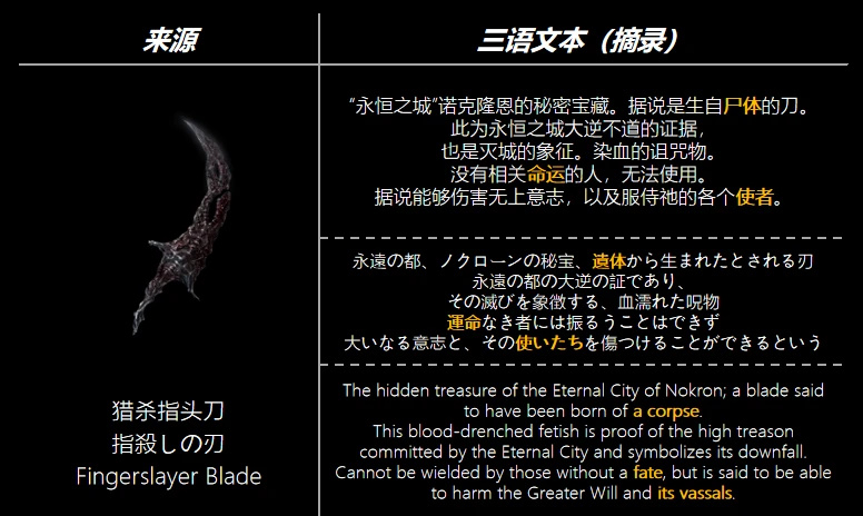 其實我們早就知道,無上意志從來沒有來到過交界地,又何來傷害無上意志一說?因此獵殺指頭刀的描述多半帶有諾克斯人的吹噓,不過,它能夠傷害無上意志的使者指頭,相信遊歷過菈妮劇情支線的玩家都知道這是條事實。