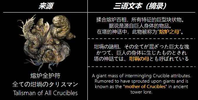巨人體內也有生命熔爐的百相象徵,還是最爲強烈的“全熔爐”(全ての坩堝)。它被稱作“熔爐之母”的線索則進一步暗示了我先前提出的血火同源理論:惡神和真實之母是二位一體的存在。