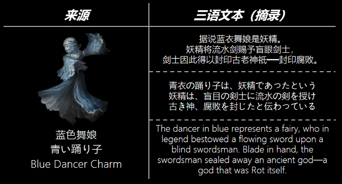 一名盲眼的藍衣劍士在妖精藍衣舞娘(Blue Dancer)的傳授下學會了流水劍(Flowing blade)。在流水劍的加持下,藍衣劍士成功再次將腐敗封印至地底,這就是腐敗湖(Lake of Rot)的由來。據說,所謂腐敗神的“爲神本質”就在腐敗湖。