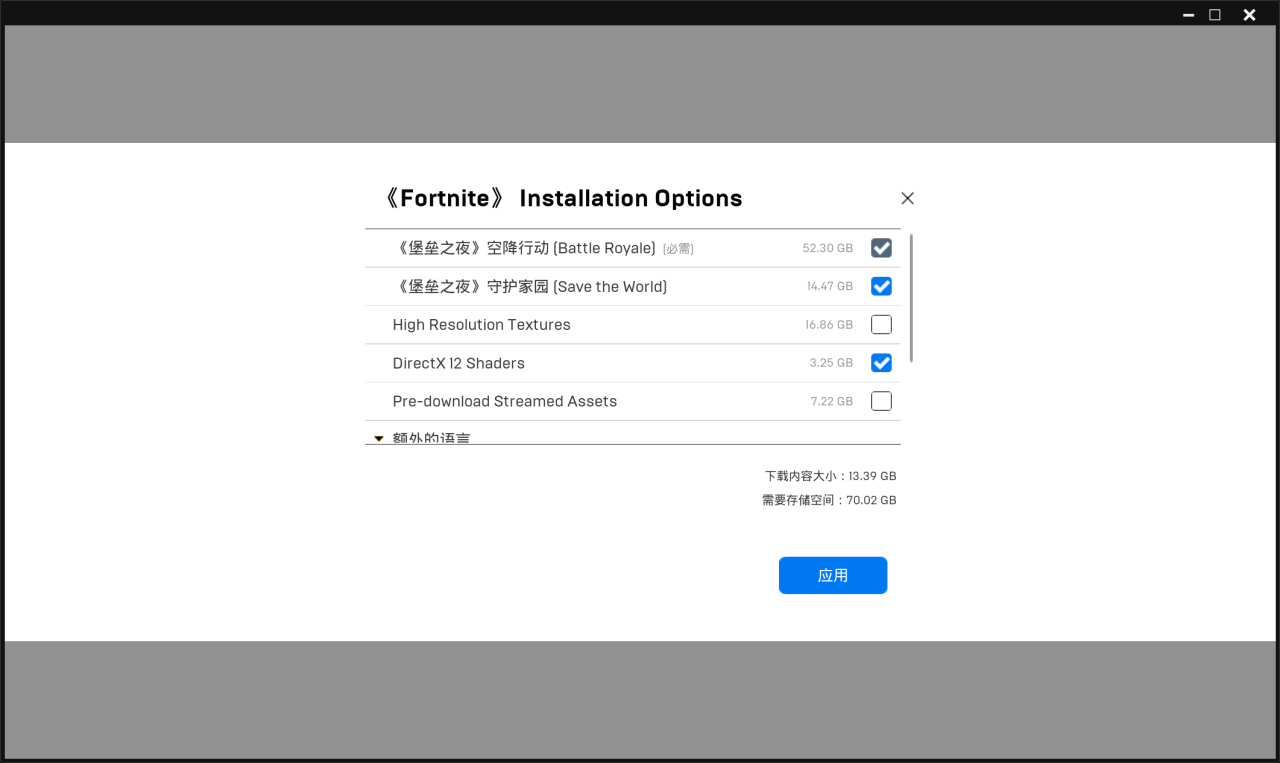 默認情況下《堡壘之夜》將會佔用你的100G+的磁盤空間,這裏我們只要選擇最近需要的部分進行勾選就可以了,正常情況下,你只需要保留“空降行動”的必選部分就可以了,這樣我們的空間佔用直接就減少了一半!