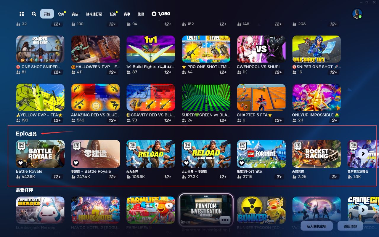我們繼續向下滾動,找到這個“EPIC出品”即可,這下面的所有模式都是官方模式,包括空降行動、無建築模式、火力全開(懷舊的老圖)、樂高生存模式、賽車模式、音遊等多種官方出品的玩法~