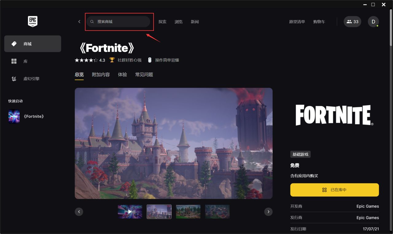 在EPIC商城中搜索“fortnite”,之後將堡壘之夜添加入庫即可!