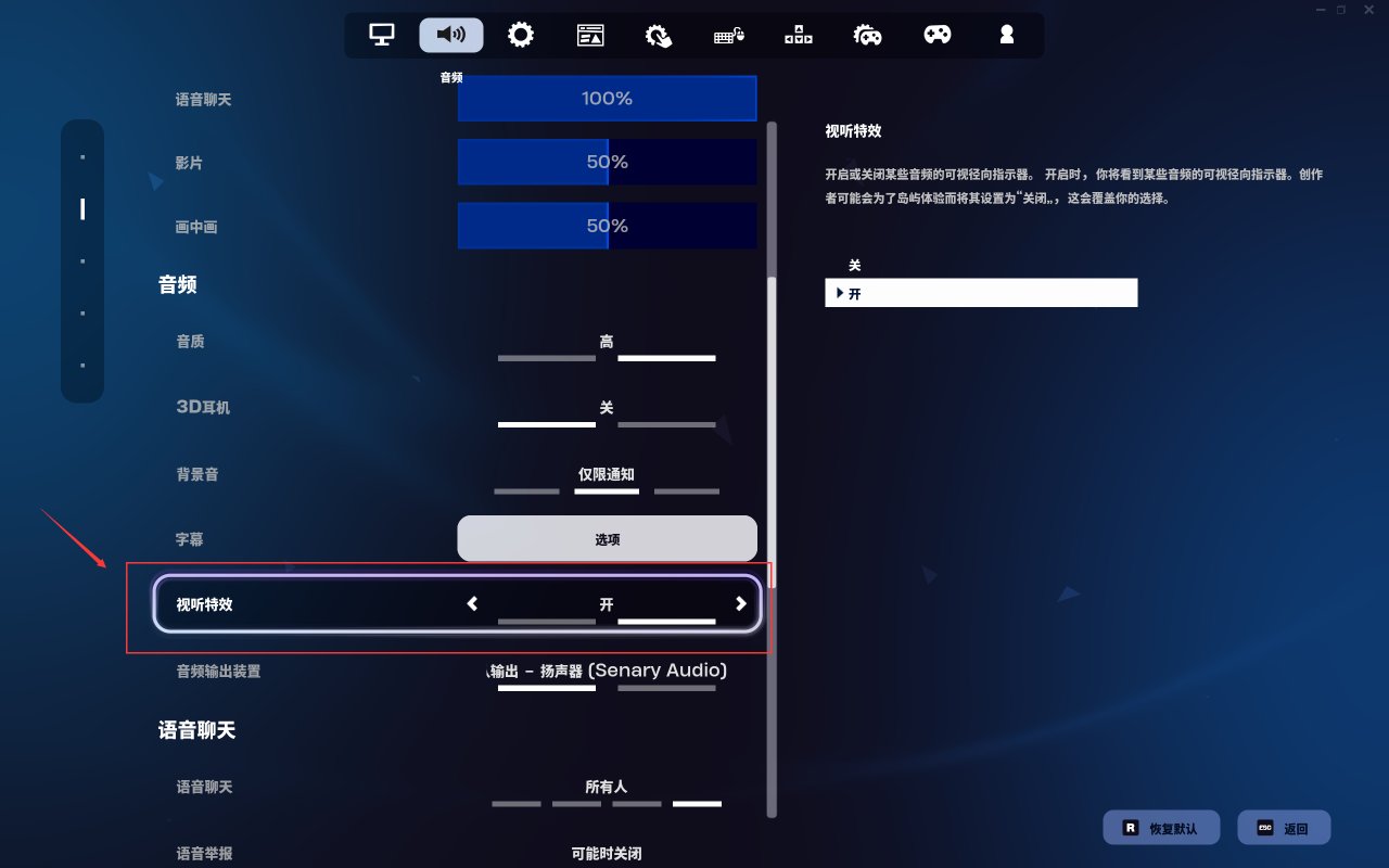 音量設置中可以下滑找到”視聽特效“,對於不太會聽聲辯位的玩家來說非常友好。