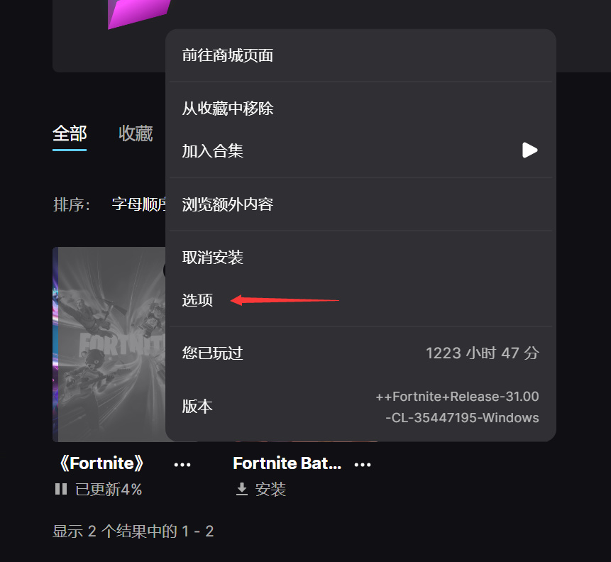 在“庫”中找到《Fortnite》,點擊代表設置的三個點,然後點擊“選擇”。