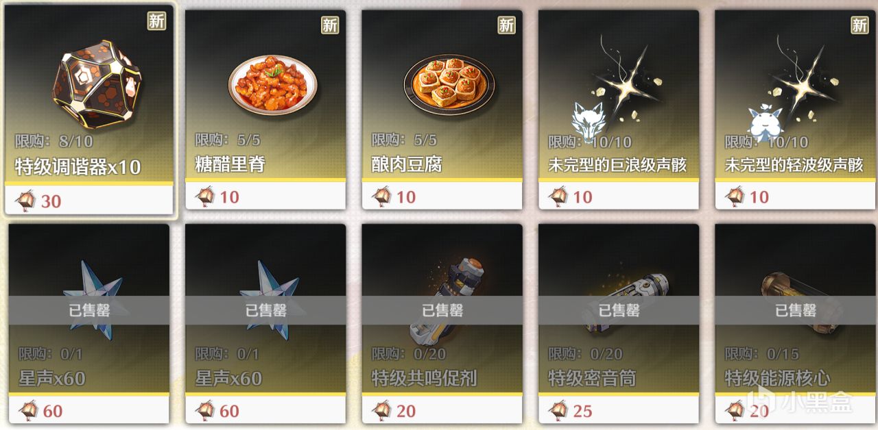星聲>三大經驗道具>技能升級材料>貝幣>調諧器>角色突破材料>>聲骸>菜餚類